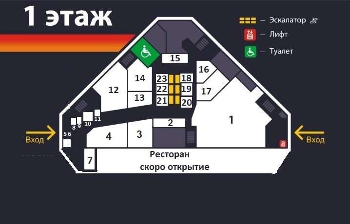 11. 5lb– спортивное питание12. Большие девочки - женская одежда13. Qwazzi - одежда14. Lamoda15. Сбербанк – банкомат и терминал16. Lafit - женская одежда17. Головные уборы18. Мир Колготок19. Кора – косметика20. Место сдаётся в аренду |